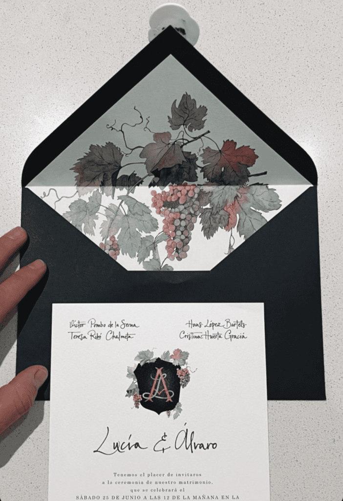 Un ejemplo muy actual de invitaciones de boda sería el usado para la boda de la influencer, Lucia Pombo y su pareja, Álvaro. En este caso los novios optaron por un diseño clásico a papel, con una acuarela y logo personalizados, forro del sobre acorde a la personalización y sello. Con esto, da a entender a sus invitados que un elemento muy importante en la boda será el vino, además de tratarse de una boda bastante tradicional. Algo que muestra claramente sus personalidades.